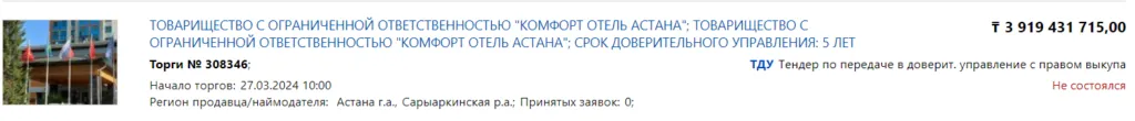 4 апреля Управление по инвестициям и развитию предпринимательства столицы выставили отель на торги снова. На этот раз вместо пятилетнего управления с правом выкупа, акимат предлагает покупателю все 100% доли участия в ТОО «Комфорт отель Астана». Стартовая стоимость актива составляет 3 919 431 715 тенге. Уставной капитал компании превышает 3,7 млрд тенге. Долгосрочные и краткосрочные активы за 2023 год лишь немногим превышают 3,9 млрд тенге.