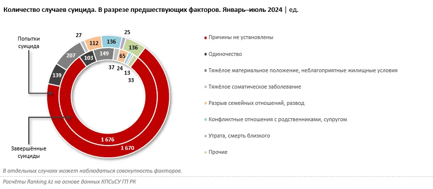 Как показал анализ, из 4,5 тысяч попыток или завершённых суицидов за семь месяцев текущего года только в 852 случаях были заведены уголовные дела по статье 105 УК РК «Доведение до самоубийства». Из них только 8 дел были переданы в суд. Численность погибших по уголовным делам в сравнении с общим числом самоубийц относительно невысока: всего 304 из 2,1 тысяч человек.