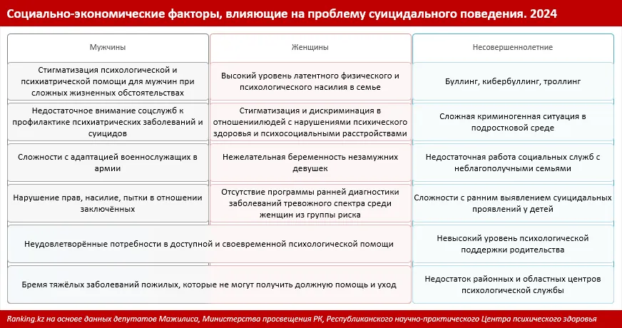 Судя по анализу публикаций в СМИ, чаще всего в казахстанском обществе поднимается проблема подростковых суицидов и семейно-бытового насилия в отношении женщин, приводящего к самоубийствам. Эти две категории — женщин и детей — выделяют в отдельные группы как менее защищённые. Вместе с тем статистика КПСиСУ ГП РК показывает, что суициды в Казахстане — чаще всего проблема взрослых мужчин.