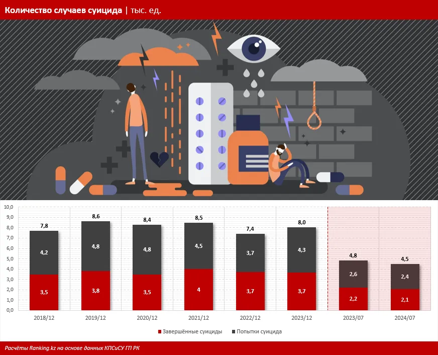 Статистика смертности от самоубийств в РК за последние несколько лет показывает нестабильную динамику, оставаясь в целом на высоком уровне. Ежегодно в стране хоронят от 3,5 тыс. до 4 тыс. добровольно ушедших (и это только по достоверно известной статистике). Фактически это по 9-10 человек в день, уточняют аналитики.