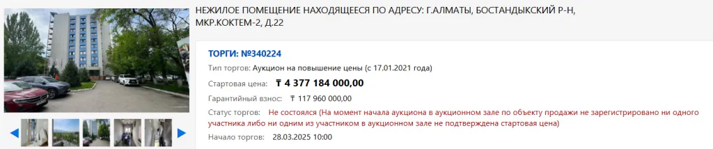 Торги должны были состояться 28 марта в 10:00. Но к назначенному времени желающих приобрести целое здание в Алматы, не нашлось.