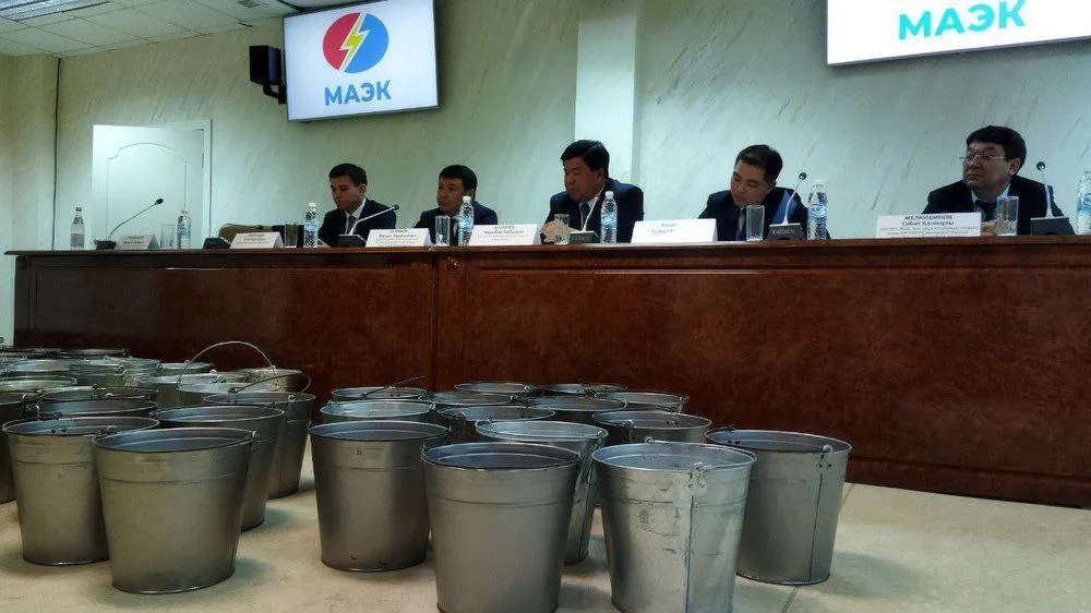 100 ведер воды принес заместитель акима Мангистауской области на общественные слушания в городе Актау. Там обсуждали намерения монополиста "МАЭК" повысить стоимость питьевой воды.