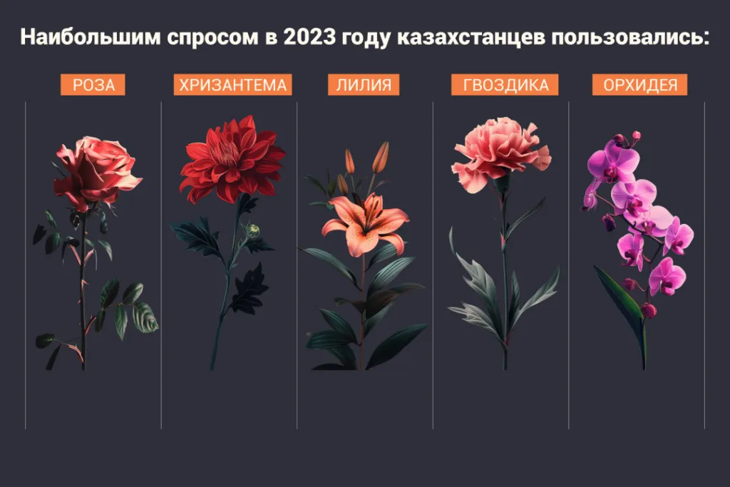 «В 2023 году Казахстан отправил в соседние страны цветов на 2,7 млн долларов. Экспорт в Россию составил 2,5 млн долларов, в Кыргызстан – 80,8 тыс. долларов, в Узбекистан – 55,5 тыс. долларов, а в Китай – 3,3 тыс. долларов»,