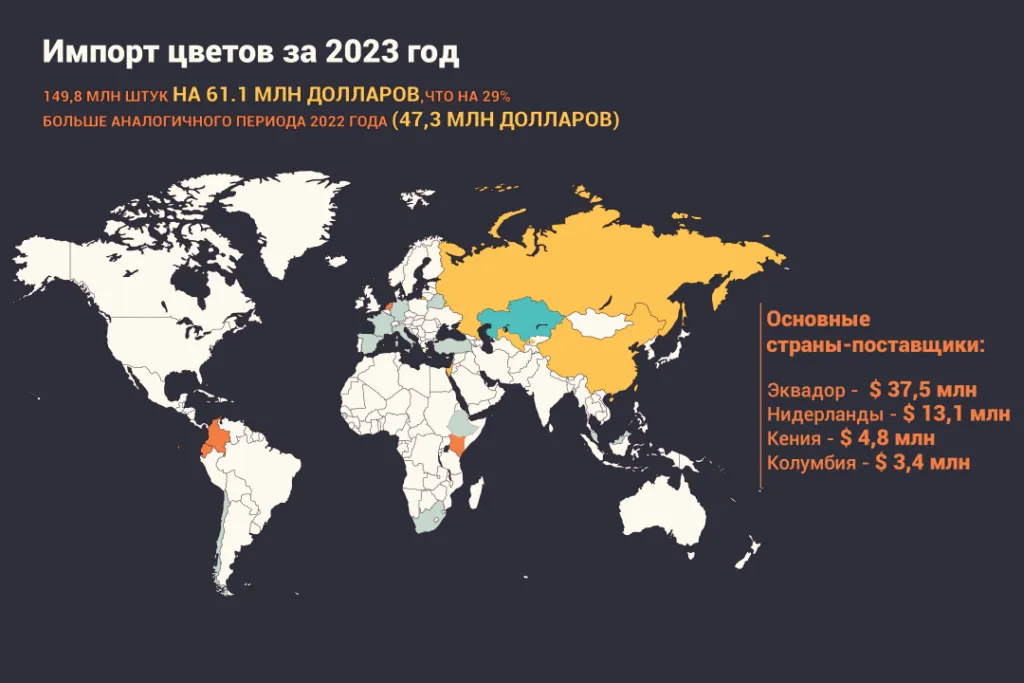 Цветы в Казахстан в основном везут из Эквадора, Нидерландов, Кении и Колумбии. Лидером в этом списке является Эквадор. Сумма закупки составила 37,5 млн долларов: