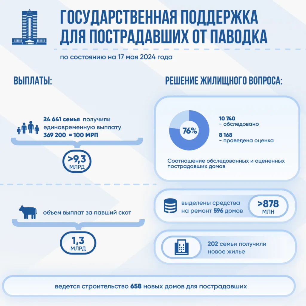 Кроме того, 24 641 семья получила единовременную выплату в размере 100 МРП на сумму свыше 9,3 млрд тенге. Объем государственной помощи за павший скот превысил 1,3 млрд тенге.