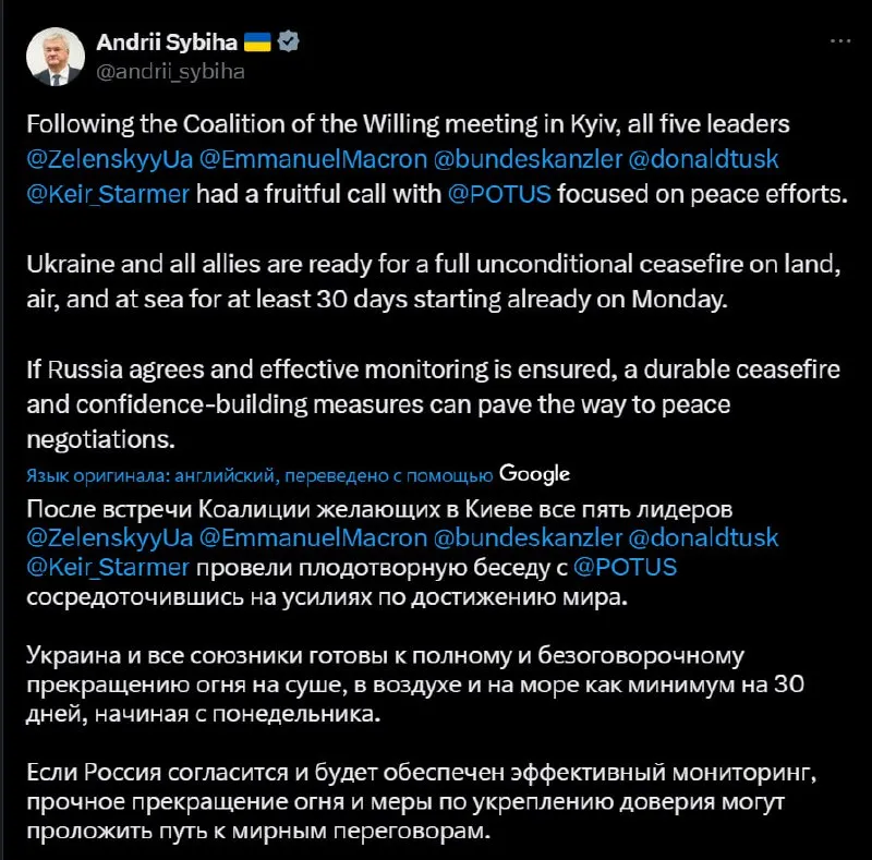 «Украина и все союзники готовы к полному и безоговорочному прекращению огня на суше, в воздухе и на море как минимум на 30 дней, начиная с понедельника. Если Россия согласится и будет обеспечен эффективный мониторинг, прочное прекращение огня и меры по укреплению доверия могут проложить путь к мирным переговорам», - пишет Сибига.