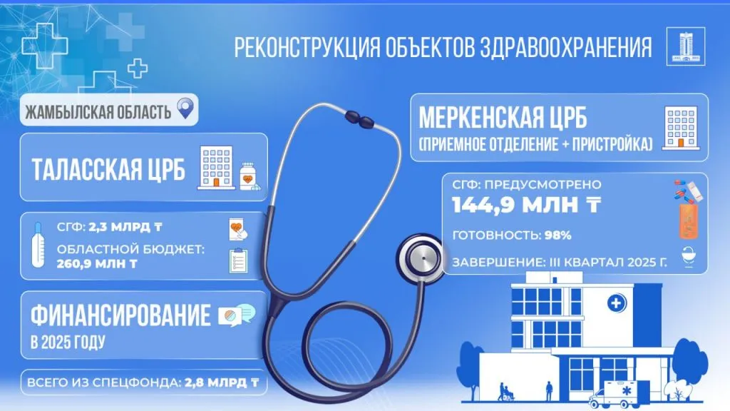 Средства потратят на реконструкцию многопрофильных центральных больниц в Меркенском и Таласском районах Жамбылской области.