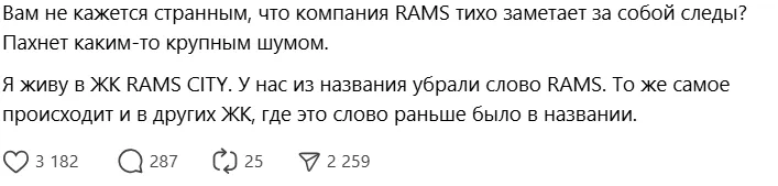 К слову, ещё до пояснения самой компании, изменения заметили алматинцы. В социальных сетях пользователи из мегаполиса отмечали, что во многих ЖК, где раньше фигурировало название Rams Qazaqstan, теперь оно исчезло.