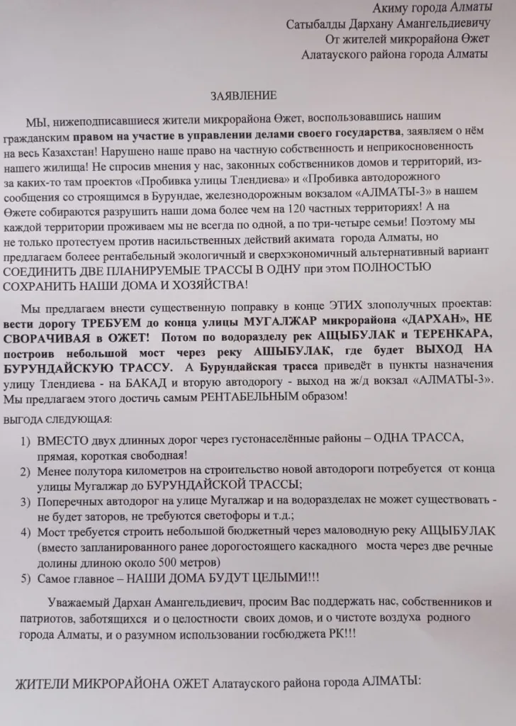 Это не первое выступление ожетовцев. В конце 2023 года они узнали: согласно Генплану в результате первой очереди реконструкции акимат выкупит 165 земельных участков. А в ходе второго этапа пробивки улицы – ещё 392. И проложит дорогу через жилые районы.