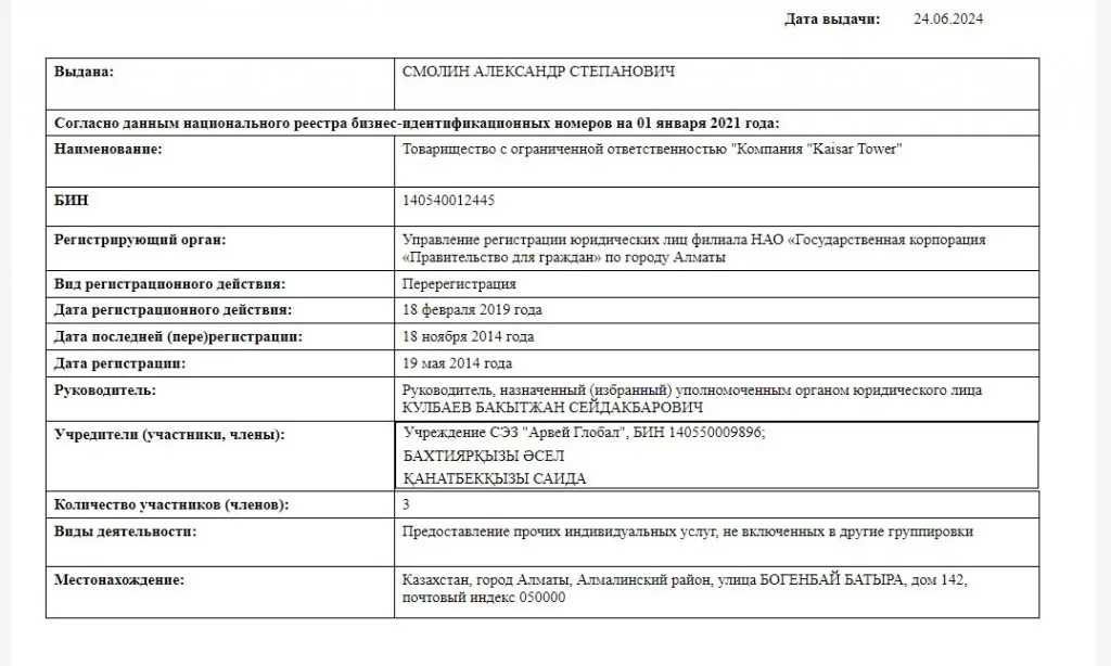 При этом широко известно, что владел Kaisar Tower и Kaisar Plaza Кайрат Сатыбалды через аффилированные с ним компании и людей. Например, на легализованные доходы он приобрёл облигации ТОО QS Holding, которая, юридически оформленная на Бакытжана Кулбаева, управляла активами в ТОО Kaisar Tower и Kaisar Plaza. Там же Бакытжан Кулбаев и числился первым руководителем или учредителем до 2022 года, пока ТОО не ликвидировали.