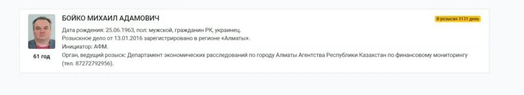 «Департамент АФМ по Алматы разыскивает гражданина РК 61-летнего Михаила Бойко за совершение преступлений по ч.3 статьи УК РК «Уклонение от уплаты налогов», ч.3 статьи 218 «Легализация (отмывание) денег и иного имущества, полученных преступным путем» УК РК», — говорится в сообщении.