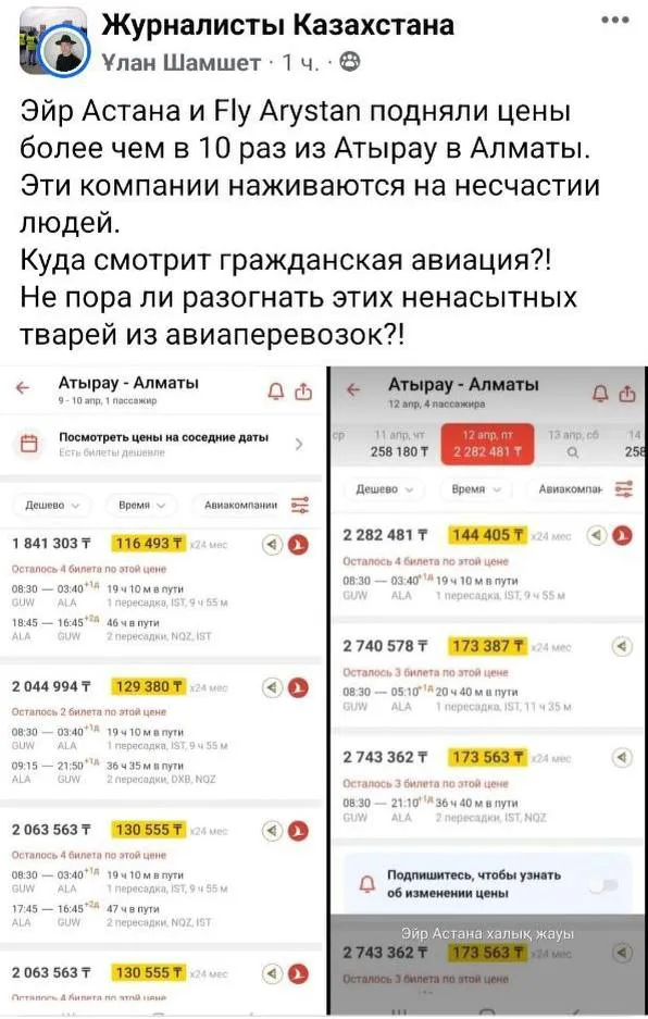 Однако в социальных сетях казахстанцы жалуются, что цены на билеты из Атырау в Алматы подняли более, чем в 10 раз.