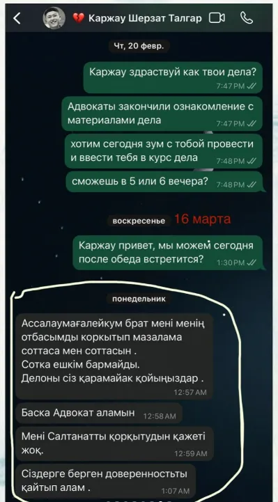 «Важно учитывать, что у Каржау уже есть два незакрытых дела: сопротивление при аресте и причинение ущерба машине государственного служащего во время перекрытия дороги. Отказ от участия в судебном процессе мог бы стать третьим нарушением, а рецидивы только ухудшают положение в суде. Я объяснил эти риски, но мои слова были — восприняты как запугивание - именно об этом Каржау написал в скриншоте», - сообщил Амангельды.