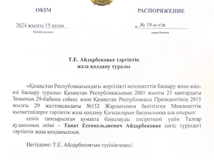 В приказе главы области также сказано, что за ослабление контроля на вверенной территории акиму Талгарского района Танату Айдарбекову объявили дисциплинарное наказание в виде строгого выговора.