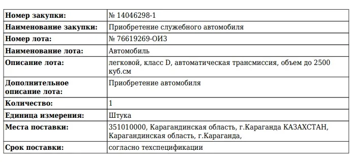 Объявление о приобретении служебного автомобиля появилось на сайте 18 февраля, а сделка состоялась спустя два дня. В тендере не участвовали другие компании, способ проведения закупки – из одного источника по несостоявшимся закупкам.