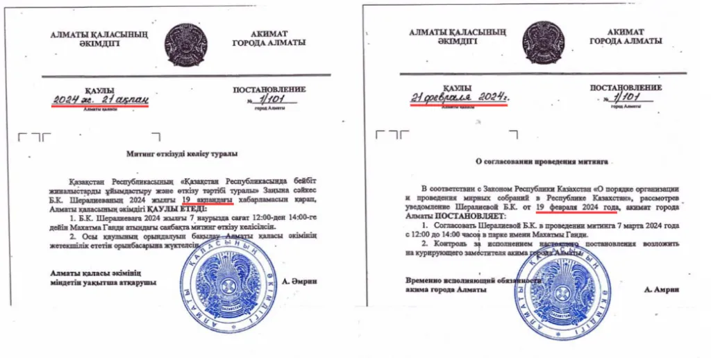 «В связи с этим, в целях обеспечения безопасности участников мирных собраний, во избежание нарушения прав жителей города и других лиц, недопущения нарушения общественной безопасности акиматом города Алматы было вынесено решение о несогласовании шествия и митинга феминистских организаций», — говорится в ответе на запрос.
