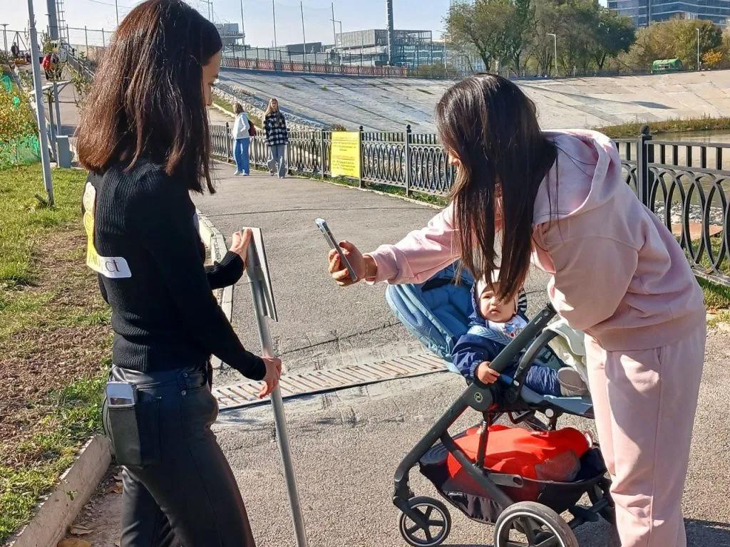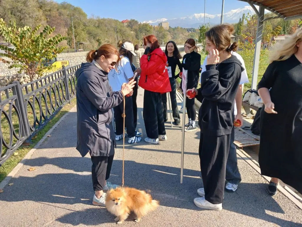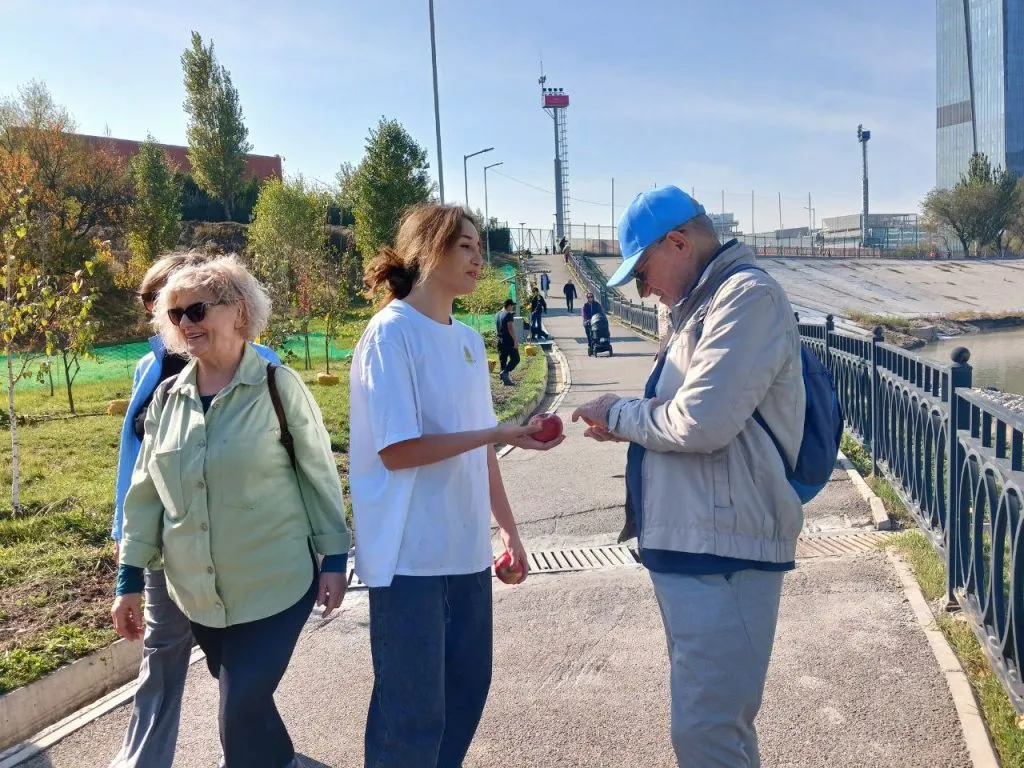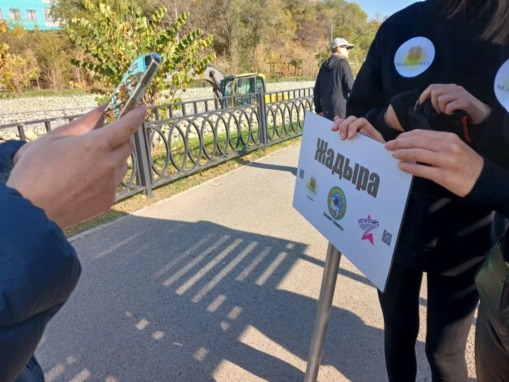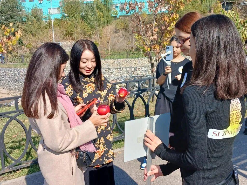 Воскресным днём возле реки Есентай на “Новом терренкуре” собралась толпа молодых людей. Это волонтеры проекта «Sezim Project» — ученики старших классов. Девушки угощали прохожих алматинскими яблоками, предлагая взамен отсканировать QR-код на табличке с именем и подписаться на соцсети проекта.