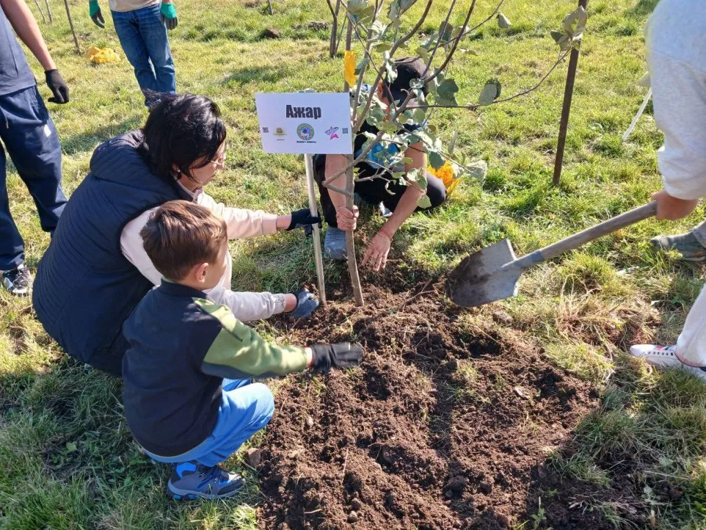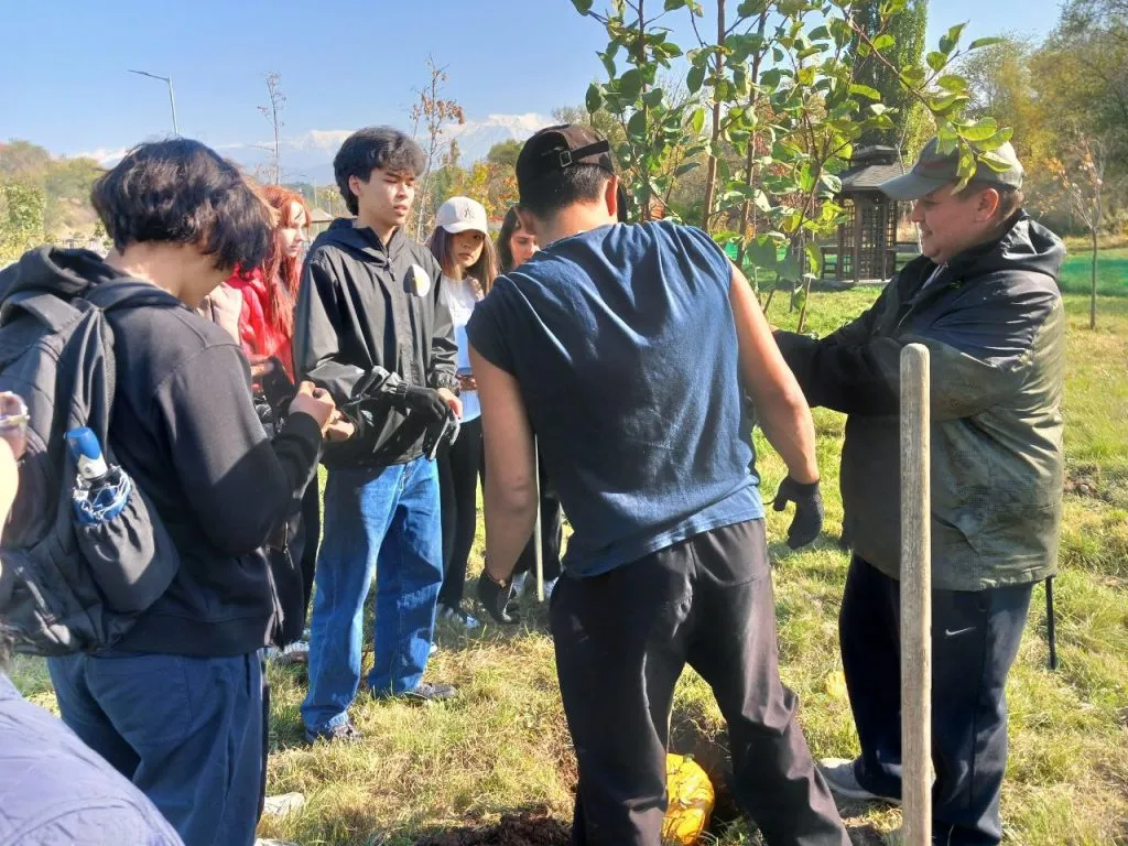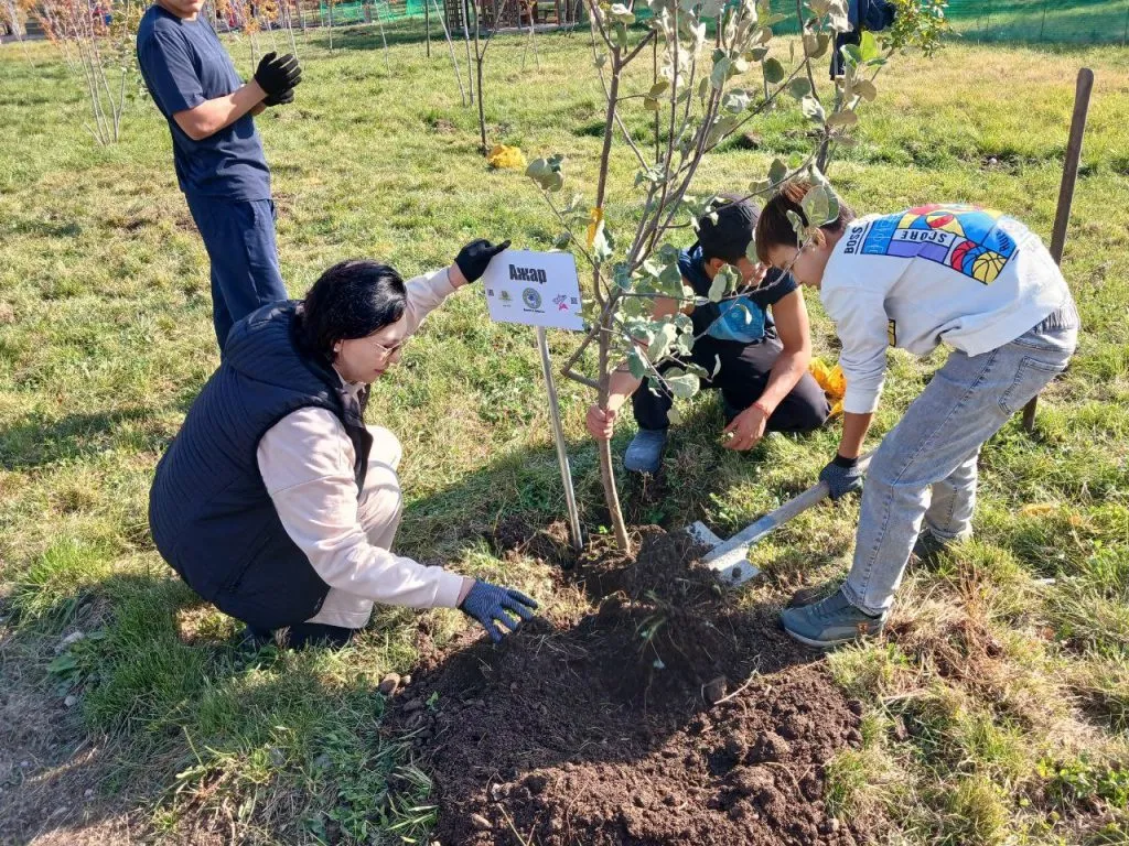 Первое посаженное волонтерами дерево носило имя Салтанат Нукеновой. Помочь ребятам и поддержать акцию пришёл писатель, экономист публицист и общественник Бекнур Кисиков.
