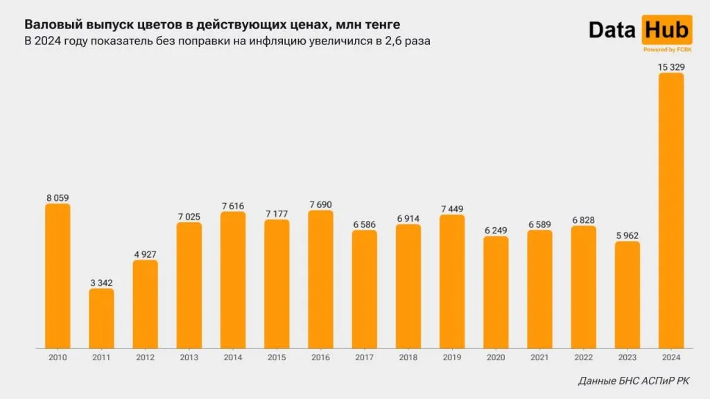 В Казахстане резко взлетел валовый выпуск цветов. Как пишет Первое кредитное бюро, по итогам 2024 года общая стоимость выращенных цветов составила 15,3 млрд тенге, увеличившись г/г без поправки на инфляцию сразу в 2,6 раза. Это рекордный максимум за 15 лет.