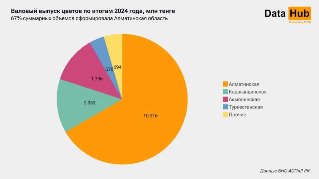 К сильному скачку мог привести запуск новых производств либо расширение существующих. Сейчас объёмы Алматинской области в сопоставимых пропорциях распределили между двумя районами - Карасайским ( 5,8 млрд тенге) и Илийским ( 4,4 млрд тенге). Но так было не всегда, в 2023 году выпуск в регионе практически отсутствовал, а в 2022 году цветы выращивали преимущественно в Карасайском районе (1,9 млрд тенге).