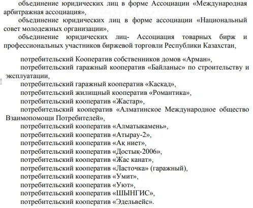 - Потребительские кооперативы «Жастар», «Алматинское Международное общество Взаимопомощи Потребителей», «Алматыкамень», «Атырау-2», «Ақ ниет», «Достық-2006», «Жас канат», «Умит», «Уют», «ШЫНГИС», «Эдельвейс»