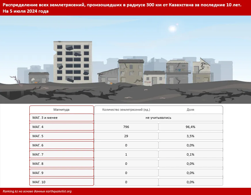 "Большинство землетрясений в Казахстане имеют магнитуду четыре балла (96,4% от общего числа). Однако были зафиксированы 29 землетрясений магнитудой в пять баллов и одно магнитудой в семь", — пишут эксперты.