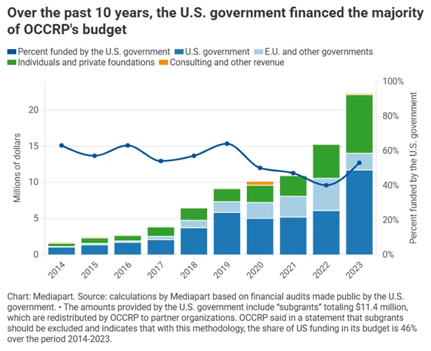 «С момента своего создания OCCRP получил не менее 47 миллионов долларов от правительства США. К этому следует добавить 1,1 миллиона долларов, полученных от Европейского союза, и 14 миллионов долларов, полученных от шести европейских стран: Великобритании (семь миллионов долларов), Швеции (четыре миллиона долларов), а остальное поступило от Дании, Швейцарии, Словакии и Франции (чье министерство иностранных дел в прошлом году пожертвовало 100 тысяч долларов). Согласно расчётам, все эти правительства в совокупности обеспечили 70% годового бюджета OCCRP за период 2014 – 2023 годов, из которых только США предоставили 52%. В 2023 году Вашингтон выплатил НПО 11,7 млн долларов, что составило 53% её расходов в тот год», – указало в материале французское издание Mediapart.