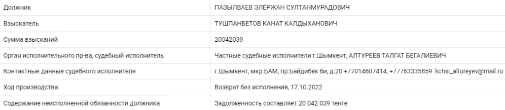С виду положение Пазылваева достаточно устойчиво, если не одно "но". Он задолжал более 20 млн тенге Канату Тушпанбетову. Исполнительный лист выписали в июне 2021 года. На просторах интернета господин Тушпанбетов значится директором Шымкентского филиала ТОО "Ломбард RAMAD FINANCE".