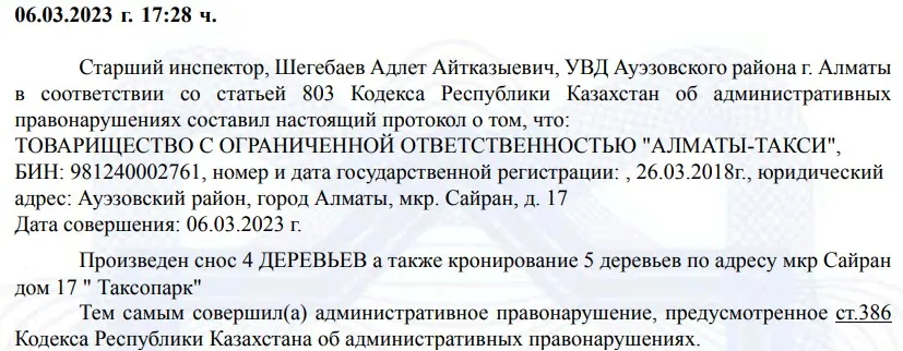 При этом штраф предприятию выписали именно по адресу регистрации. Сотрудники УВД Ауэзовского района Алматы выписали компании протокол за уничтоженные четырёх деревьев и обрезку кроны ещё пяти как раз в мкр Сайран, дом 17. Произошло это в марте 2023 года. Оплатить компания должна была 103 500 тенге .