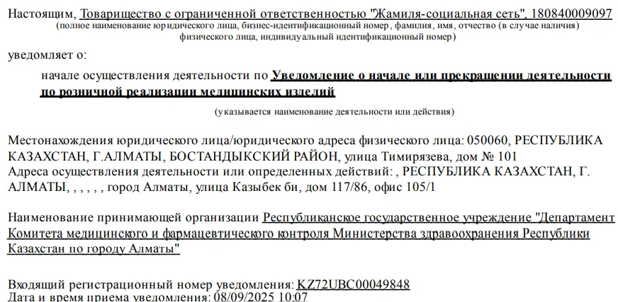 Несмотря на громкую вывеску с совой в медхалате и надпись "Рауза", новая аптека в БЦ «Galianos» к этому бренду относится не напрямую. Как оказалось, розничной реализации медицинских изделий в офисе 105/1 занимается ТОО "Жамиля-социальная сеть". Уведомление компания в соответствующие госорганы отправила 8 сентября за несколько дней до заезда.