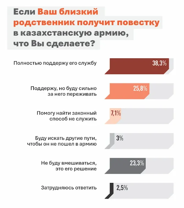 В ходе опроса граждан спросили, как они отреагируют, если их родственник (брат или сын) получит повестку в казахстанскую армию.