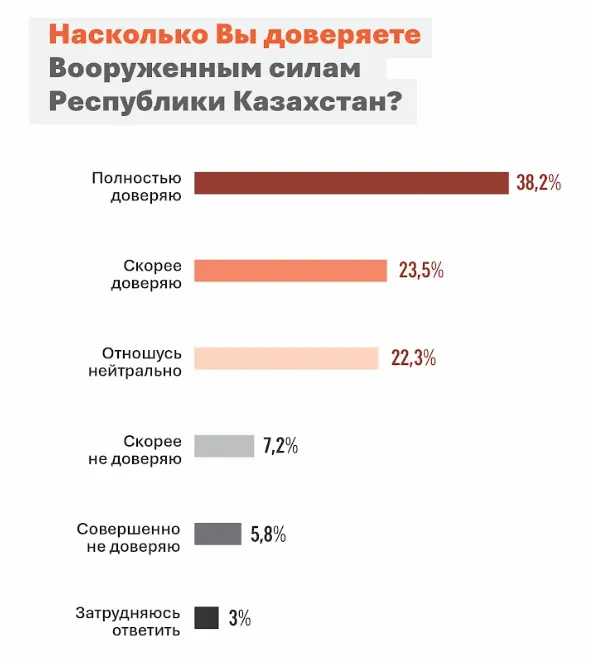 Несмотря на проблемы, 61,7% респондентов выразили доверие вооруженным силам Казахстана, им оппонируют 13%, которые не доверяют армии. 22,3% выразили нейтральное отношение.