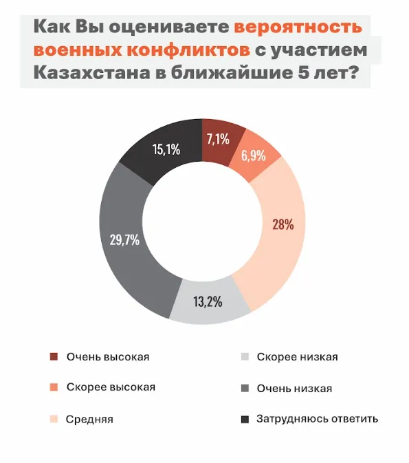На фоне сложной геополитической ситуации в мире респондентов попросили оценить вероятность военных конфликтов с участием Казахстана в ближайшие пять лет. 14% допускают такой сценарий.