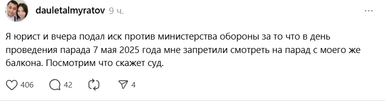 "Я юрист и вчера, 26 мая 2025 года, подал иск против министерства обороны за то что в день проведения парада 7 мая 2025 года мне запретили смотреть на мероприятия с моего же балкона. Посмотрим что скажет суд", – написал казахстанец в соцсети Threads.