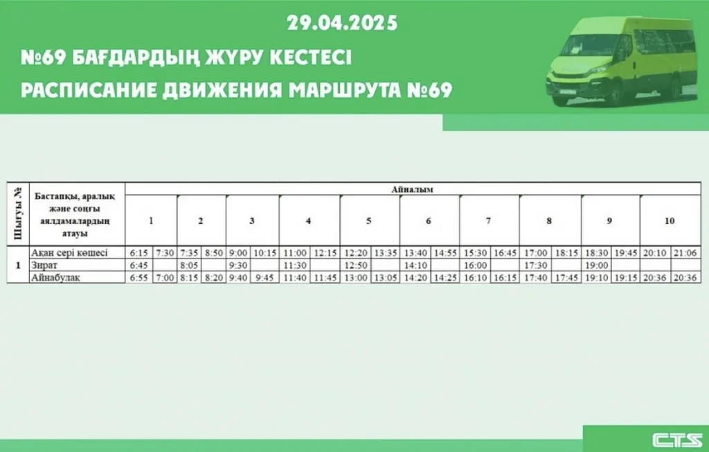 «Завтра, 29 апреля, для обеспечения транспортного обслуживания жителей города Астаны, № 69 маршрут будет курсировать до остановки «Новое кладбище», – сообщили сотрудники City Transportation System.