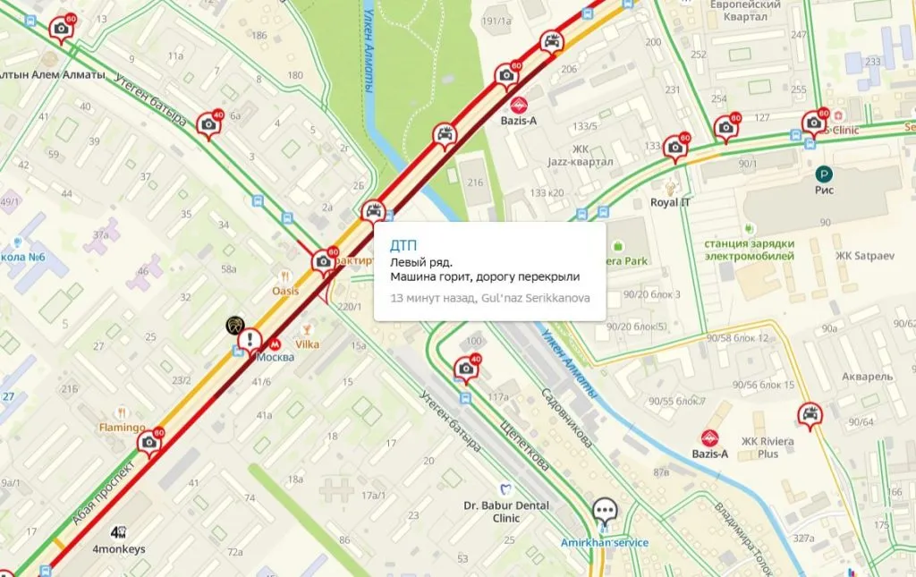 Из-за ЧС по проспекту Абая образовался затор. Судя по данным онлайн-карт, пробка образовалась в западном направлении.