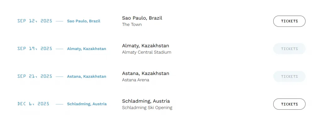Выступление пройдет на Центральном стадионе. Однако билеты в продажу еще не поступили. На официальном сайте кнопка tickets не активирована.