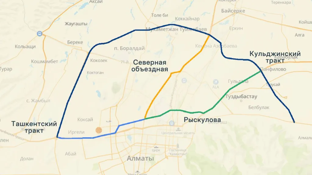 Анализ показал, что сразу после запуска БАКАД в 2023 году поток машин на Кульджинском и Ташкентском трактах заметно снизился — в среднем на 30%. Например, с 1 по 15 июня 2023 года по Кульджинскому тракту выезжали более 74 тыс. автомобилей, а после открытия трассы, с 16 по 31 июля, — уже около 48 тыс.