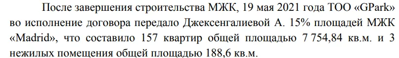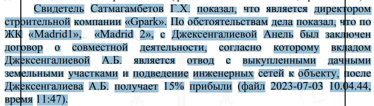 Анель Джексенгалиева и директор строительной компании Gpark заключили договор о совместной деятельности по ЖК «Madrid 1» и «Madrid 2». Это выяснилось в суде по делу о мошенничестве. По версии Сатмагамбетова, за дачные земли предпринимательница получает 15% прибыли. Анель Джексенгалиева рассказала в суде немного иную историю. Она сообщила, что ТОО «Astana Development Group» выкупил участки на собственные деньги, каждый учредитель вложил по 250 млн тенге. Эту землю она и предоставила Gpark.