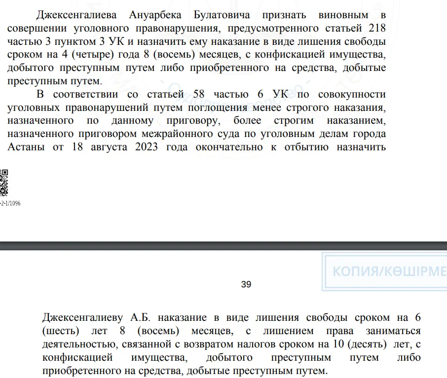 Недвижимость Джаксенгалиев реализовал через свою сестру и получил 2 184 979 200 тенге. Преступный доход составил 961,1 млн тенге.