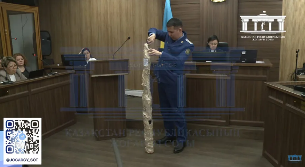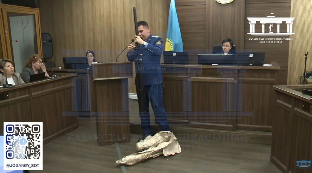 В суде также обозрели металлический штатив, которым Бишимбаев ломал дверь в туалете ресторана BAU. Прокурор Айжан Аймаганова заметила, что метровый штатив достаточно тяжёлый. При этом Бишимбаев бил им по двери туалета порядка 25 раз. В уборной тогда находилась Салтанат Нукенова.