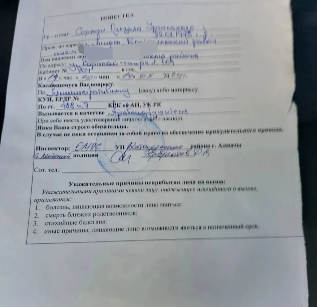По словам основательницы «Феминиты» Жанар Секербаевой, Сержан вручили повестки и увезли в управление полиции Алмалинского района.