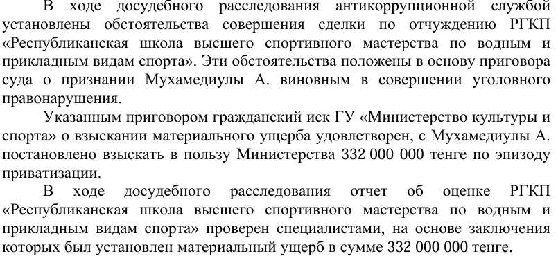 "Владелец ТОО "Nomad Land’s" (республиканская высшая школа спортивного мастерства) Амир Ахметов на заседании Межрайонного суда по уголовным делам Астаны в феврале 2024 года обратился с предложением о добровольном возврате актива в государственную собственность по согласованию с Антикоррупционной службой и Комитетом госимущества и приватизации. Своё решение Ахметов подтвердил в письменном виде. Но решением Специализированного межрайонного экономического суда Алматы судья Гульнар Сатбаева выносит противоположное решение, признав договор между "Nomad Land’s" и комитетом госимущества и приватизации недействительным", – сообщил в письме осуждённый.