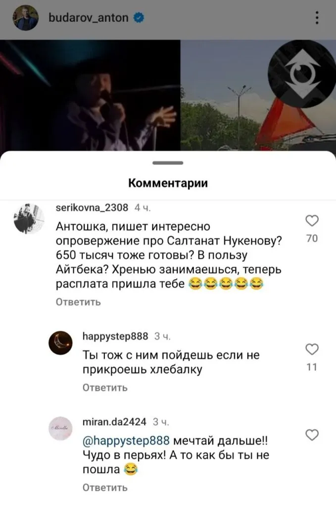 Вместе с уголовным делом в отношении Бишембаева появилось также много хейтеров, которые проявили огромное желание позлословить в отношении Салтанат, одним из таких хейтеров явился блогер Бударов Антон. В общем, облил грязью он на сколько хватило фантазии. Ну конечно, оскорблять умершего человека, наверное, дело рук только падших морально людей! В общем, брат заставит обидчика ответить за свои слова в рамках правового поля!,