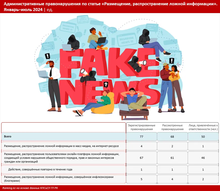 Согласно данным из отчётов Комитета правовой статистики и специальных учётов Генеральной прокуратуры РК, за шесть месяцев 2024 года в Едином реестре досудебных расследований зарегистрировали 77 административных правонарушений по статье 456-2 КоАП «Размещение, распространение ложной информации». Большая часть зарегистрированных правонарушений (67) была совершена пользователями онлайн-платформ, которые в своих комментариях к новостям или постам разместили информацию, создающую условия нарушения общественного порядка, прав и законных интересов граждан.