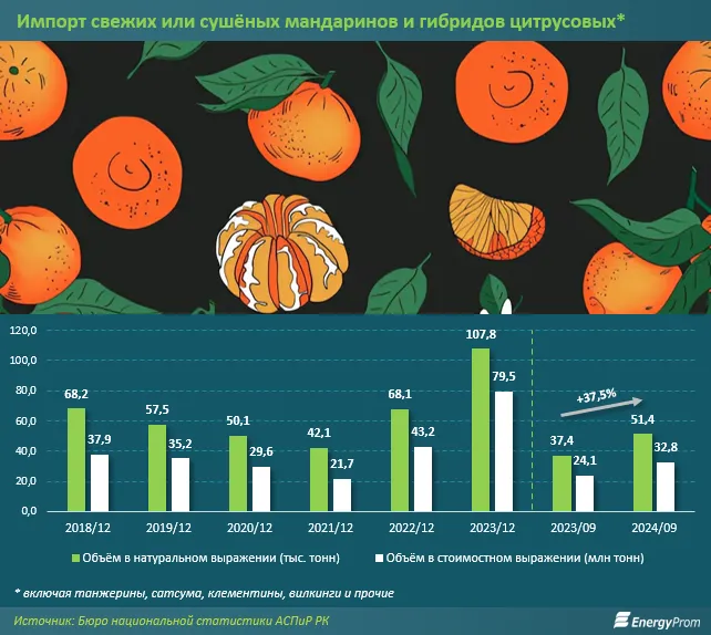 По информации Energyprom.kz, за 10 месяцев 2024 казахстанцы заплатили «мандариновым магнатам» 32,8 млн долларов. Несмотря на внушительный рост затрат, цена за тонну осталась прежней — просто начали завозить больше цитрусовых.