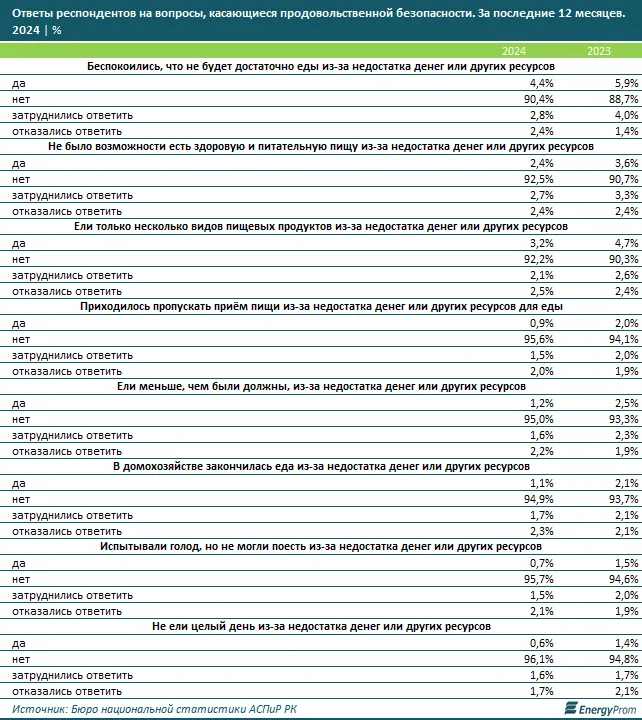 Согласно данным, 4,4% опрошенных казахстанцев заявили, что они боятся недостатка пищи из-за нехватки денег или других ресурсов. Однако большинство — 90,4%, не переживают по поводу обеспечения себя продуктами питания.