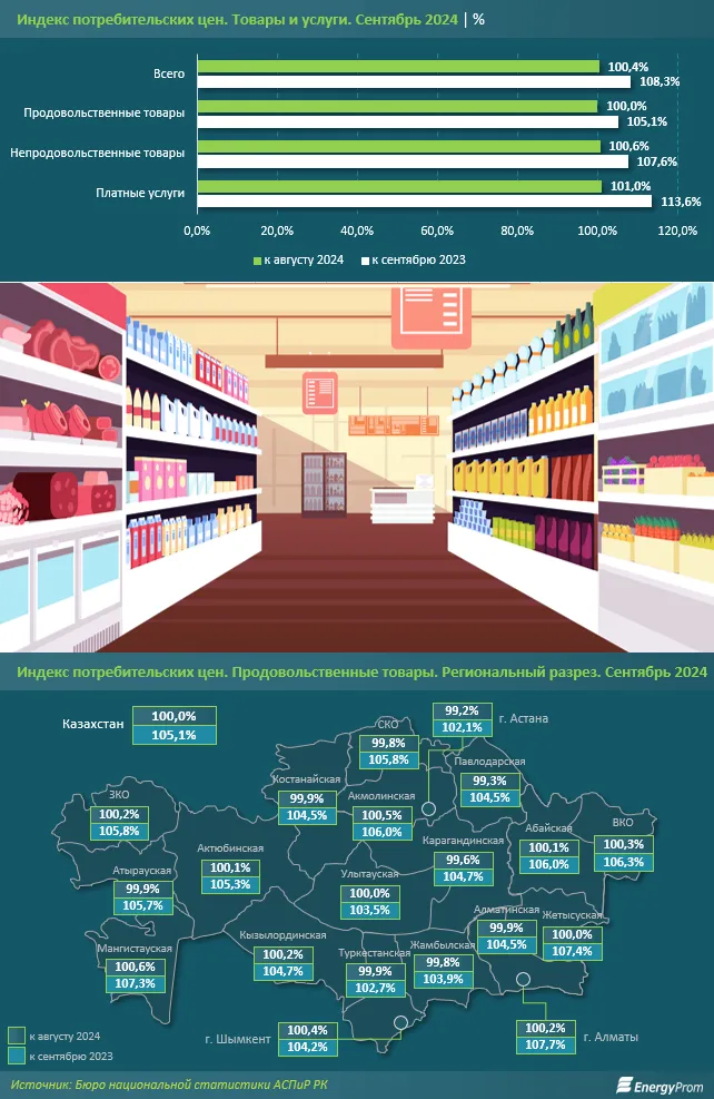 В целом в девяти из 20 регионов Казахстана в сентябре цены на продукты питания увеличились, но рост был довольно умеренным — от 0,1% до 0,6%.