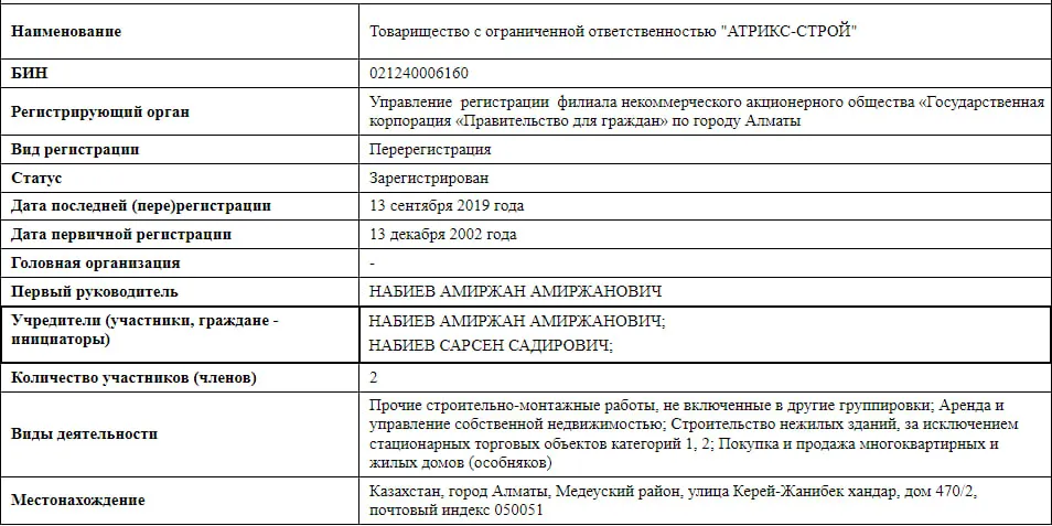 Сейчас компанией владеют сам депутат и его однофамилец Сарсен Набиев.