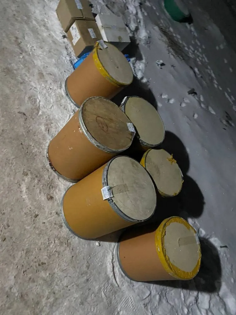 «В ходе обыска дома изъято свыше 1 тонны прекурсоров и более 10 кг готового наркотического вещества альфа-PVP. В частности, обнаружены: шесть деревянных бочек с прекурсорами, 35 стеклянных поддонов с жидкостью, предположительно содержащей психотропное вещество в процессе сушки, 33 канистры с неизвестной жидкостью, четыре мешка с порошкообразным веществом, пять противогазов с фильтрами, три вакуумных пакета с готовым наркотиком альфа-PVP общим весом около 3 кг, а также оборудование для производства наркотиков (миксеры, вакууматор, металлические детали вентиляции), весы, мобильные телефоны, системный блок и другие предметы, связанные с незаконной деятельностью», - рассказали в МВД РК.